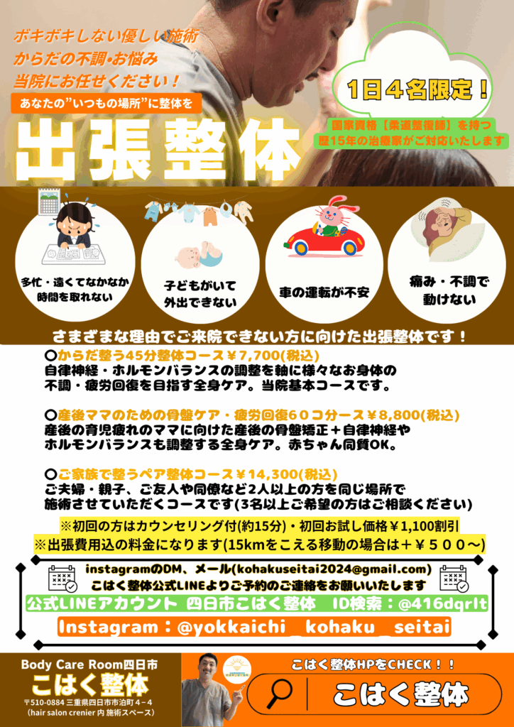 📢出張整体のお知らせ📢【こはく整体:四日市 鈴鹿 亀山 整体】