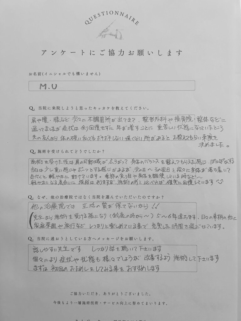 症状は余り回復せずに年が増すごとに重苦しい状態になっていたところ、夫の友人から体の硬い私でもボキボキしない痛くない所があると教えてもらい来院を決めました。
