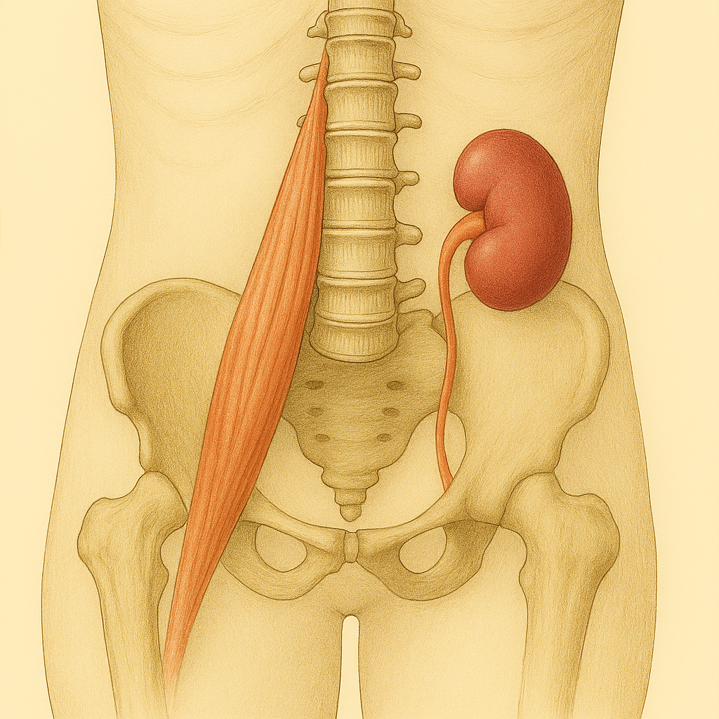 腰椎から大腿骨に向かって走る深層筋で、股関節の屈曲や体幹の安定に重要な役割を果たす筋肉です。腸骨筋とともに「腸腰筋」を構成し、姿勢や腰痛にも深く関与します。そして腎臓は後腹膜に位置し、腰椎のすぐ横で大腰筋と隣り合っています。