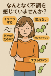エストロゲンは肌や髪の潤い、骨の強さ、精神の安定、子宮内膜の増殖(妊娠にむけた準備)などを支え、プロゲステロンは妊娠の準備や体温調整に関わり、むくみや眠気の原因にもなります。