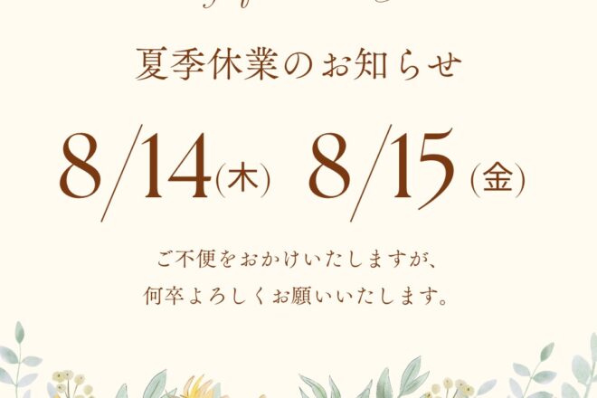 8月夏季休暇のご案内【こはく整体:四日市 鈴鹿 亀山 整体】